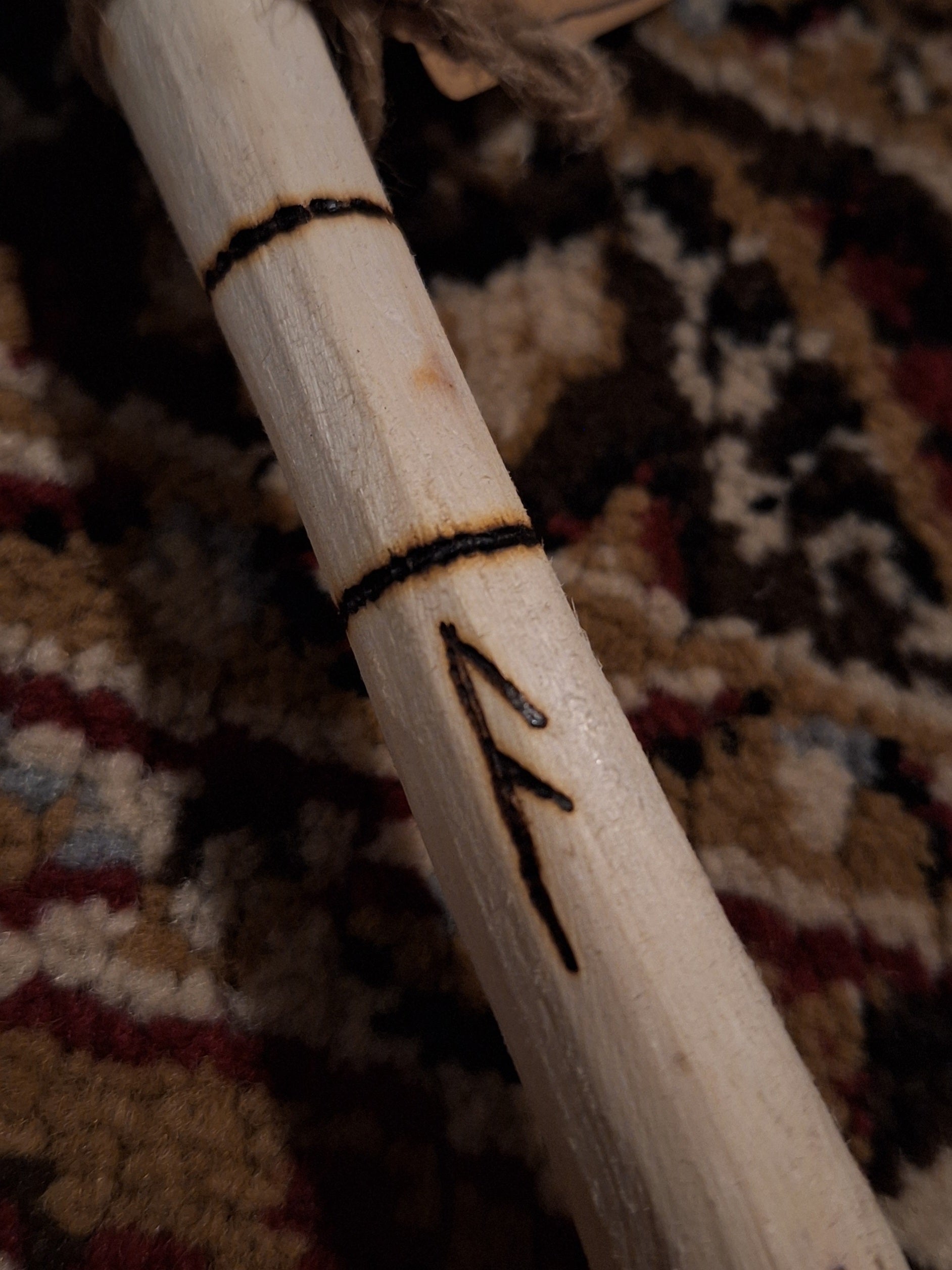 Wand made of diamond willow harvested in northern Minnesota by our family. The wand is wood burned and bears the rune Ansuz for blessings, wisdom, communication, and insight. There is also a protection charm attached to the base which contains salt, rosemary, lavender, diamond willow shavings (from wand), cloves, and gomphrena.